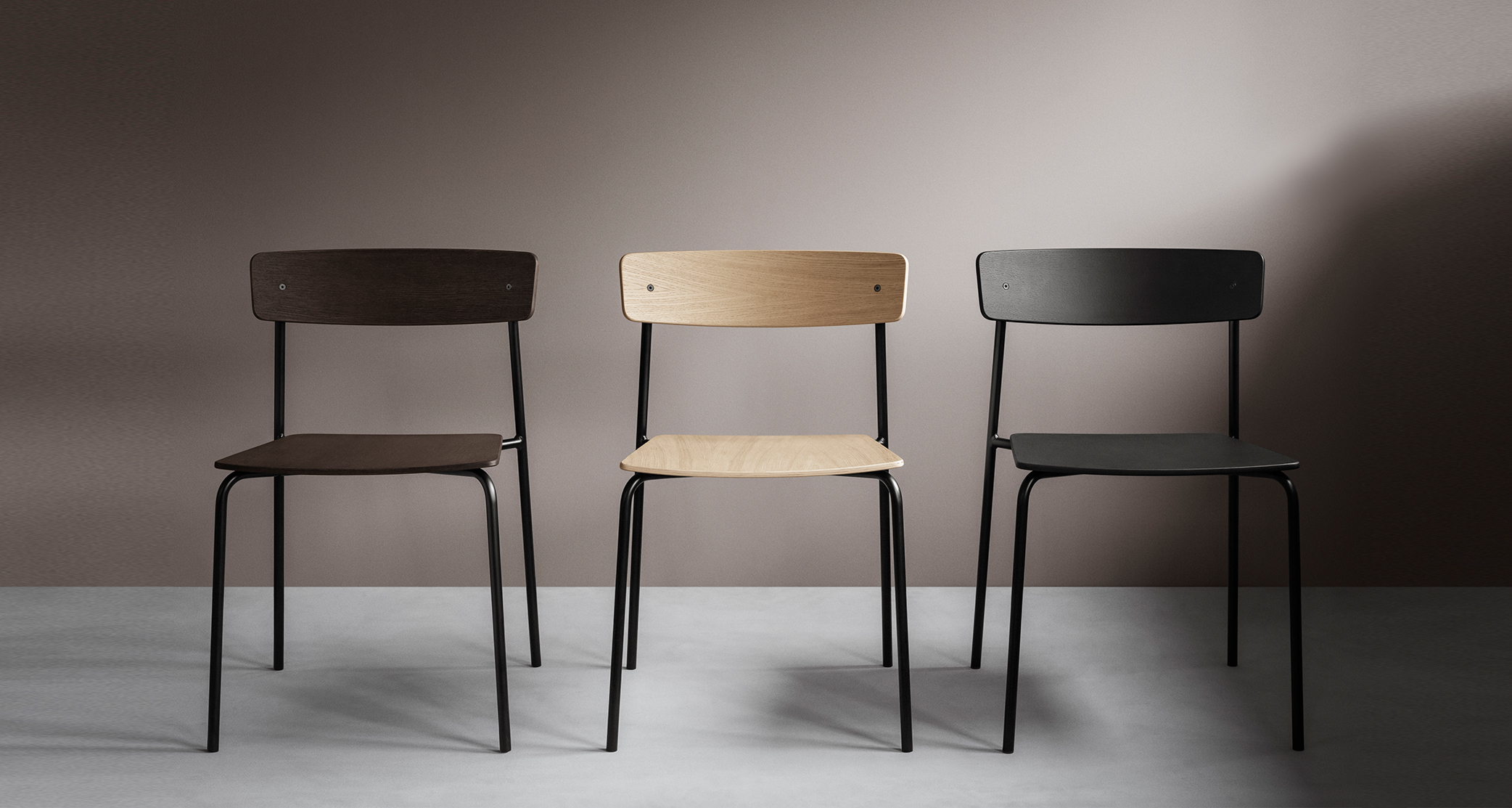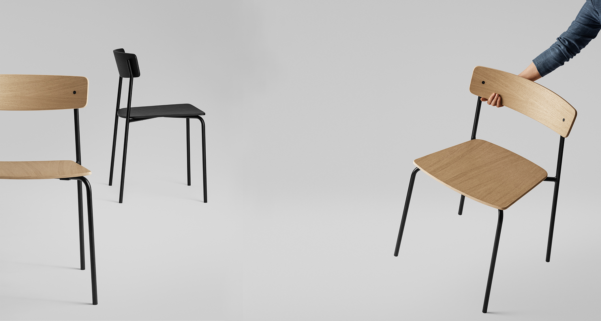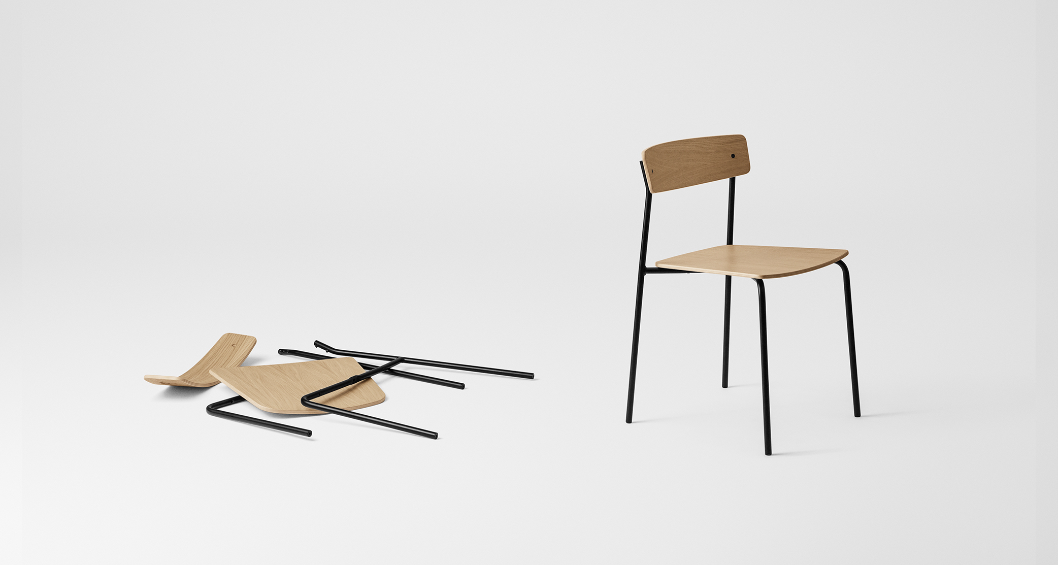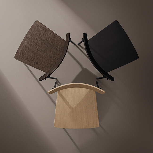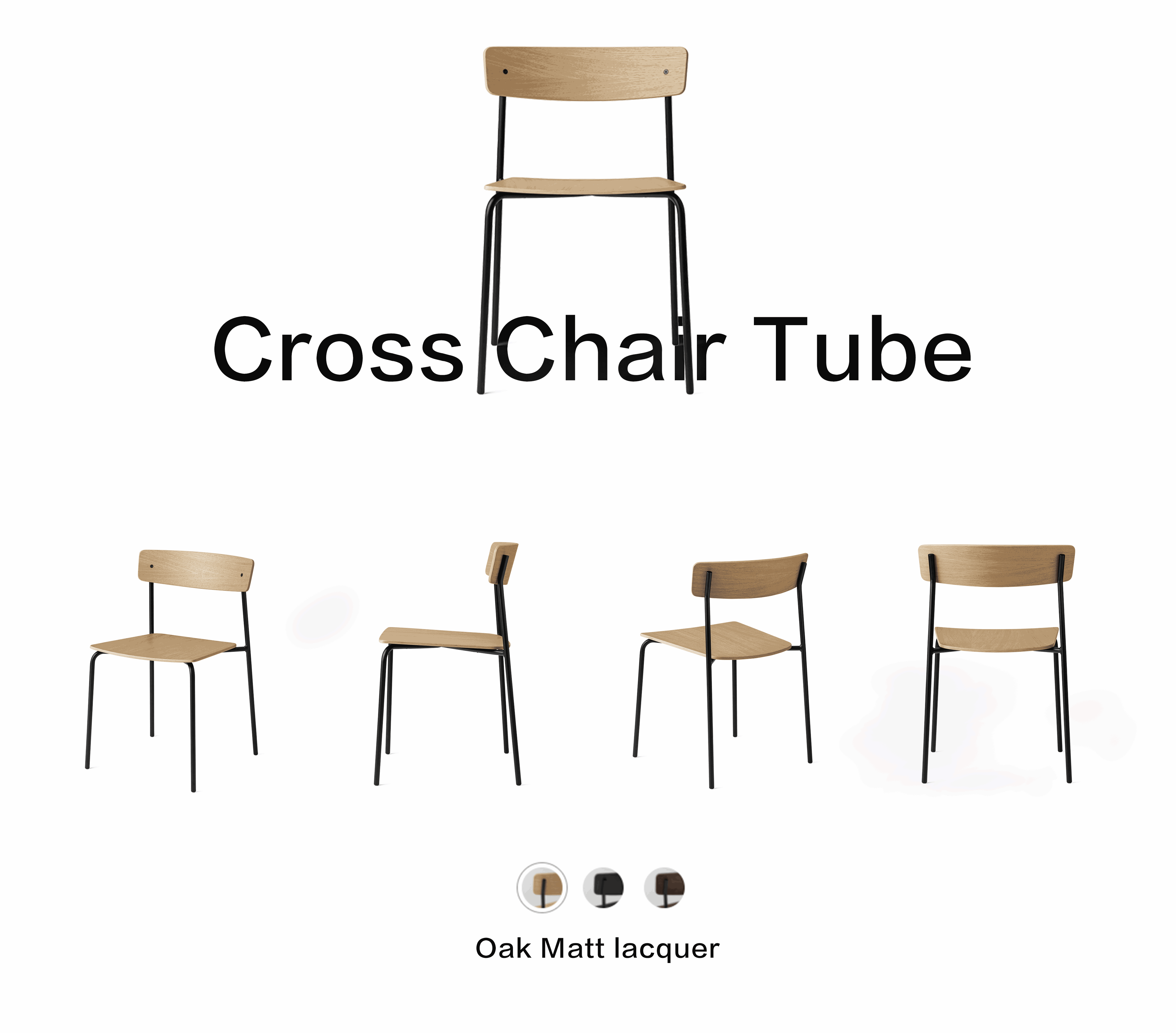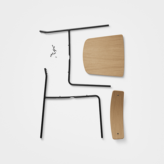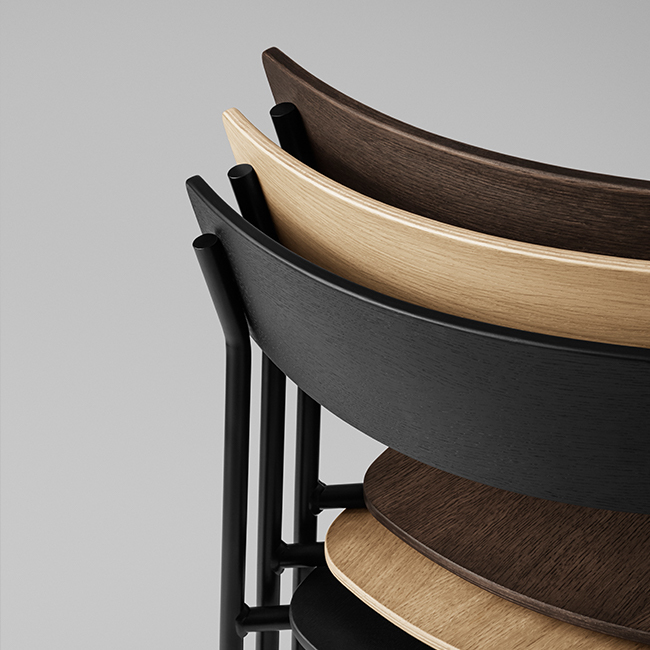 Cross Chair has a thoughtful balance of elements that create an intricate but stable experience. It’s form gives the ability to be stacked 6 at the time, as well as customised to fit any individual style. Cross Chair Tube introduces a material contrast to the oak wood of the backrest and seat, and it creates a more slender and lightweight silhouette without sacrificing strength. Furthermore, the use of a metal frame allows multiple chairs to be stacked easily for storage.