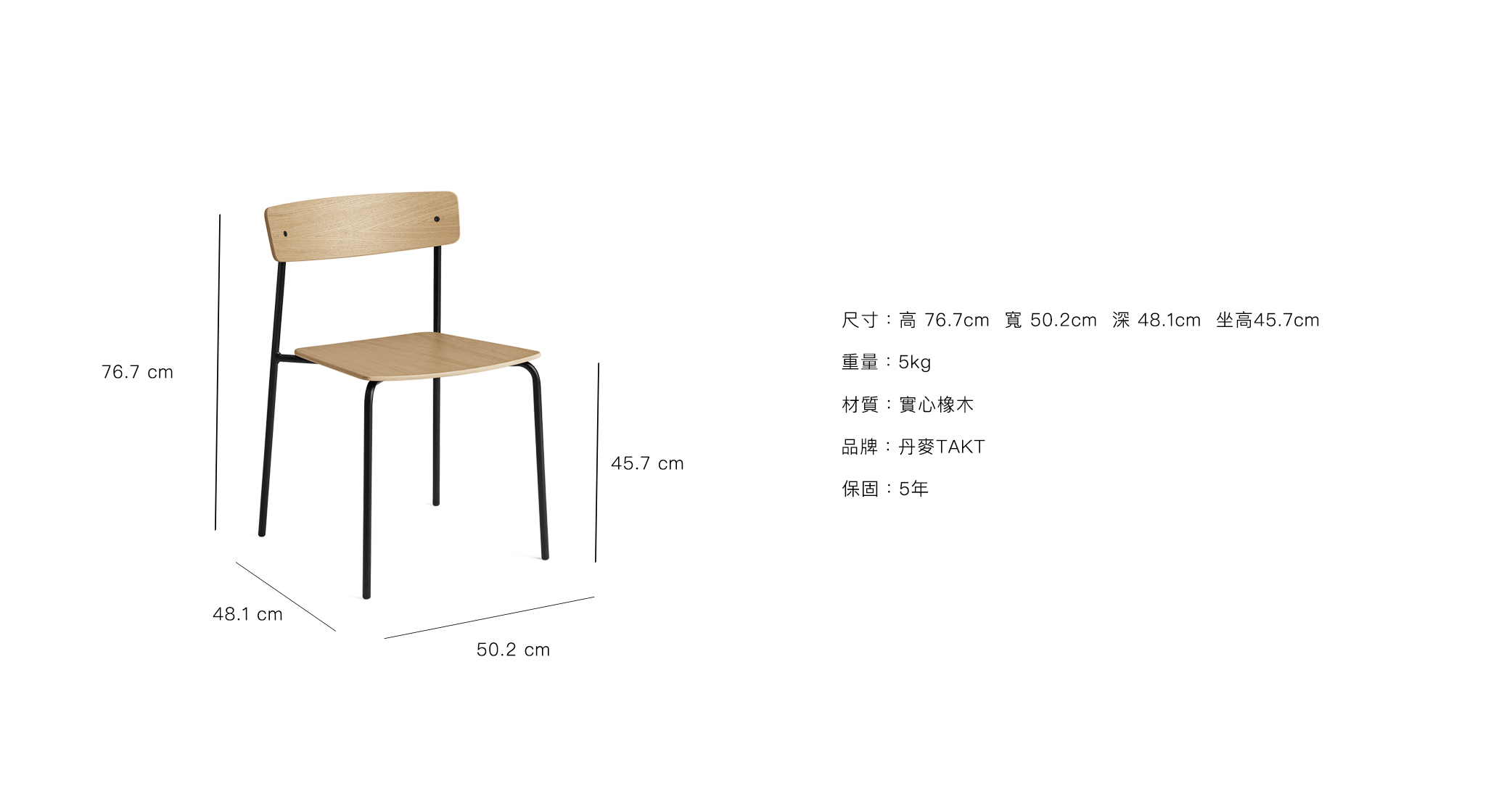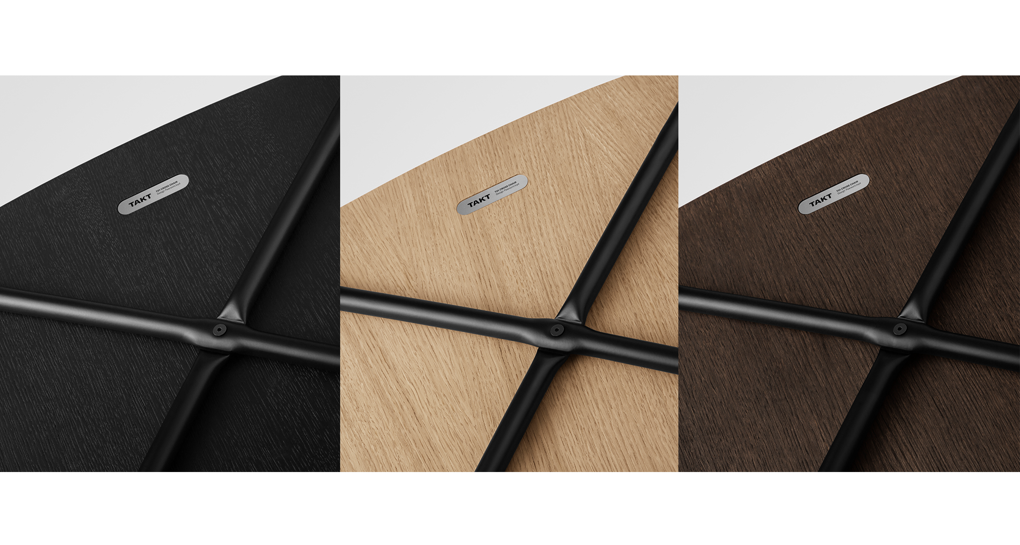 「T01經典交叉椅」的椅架由實心橡木製成:一種具有天然重量的耐用材料,為設計本身提供一種威信的認證。採用符合森林管理委員會(FSC,Forestry Stewardship Council)的認證木材,其管理標準可以保護生態系以及工人的生計。橡木特點是重硬、紋理直,結構粗,色澤淡雅紋理美觀,力學強度相當高,耐磨損,但木材不易於乾燥鋸解和切削,加工難度極大。「T01經典交叉椅」的表面塗有非常薄的天然水性亮光漆,除了強化保護木材本身的細緻結構,更便於清理。當然,除了採用符合FSC®的認證木材,TAKT也只使用符合歐盟生態環保標章(Eco-label)的羊毛及最好的苯染皮革。