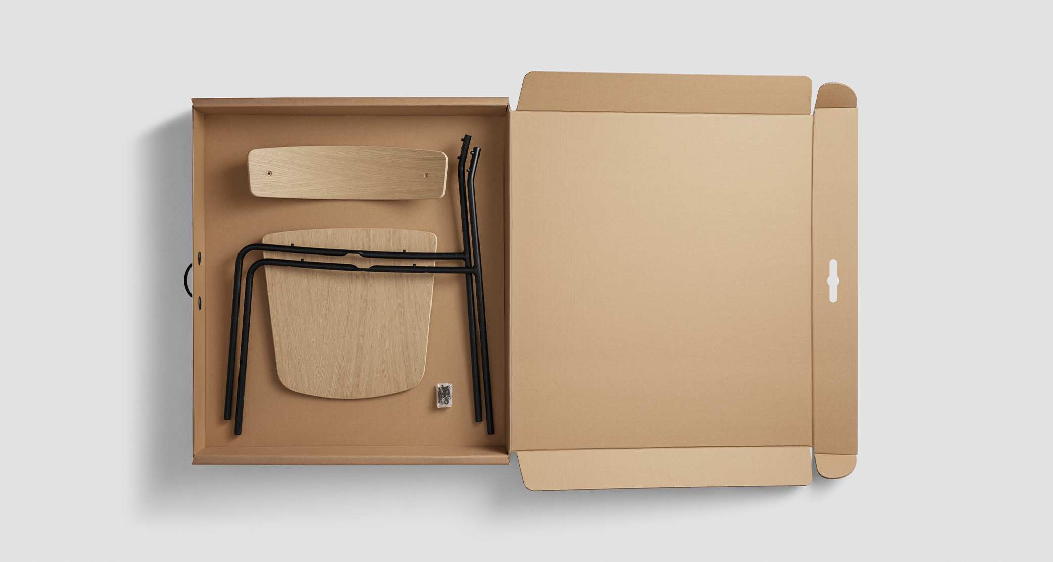 「T01 Cross Chair」符合TAKT內部環保生態設計原則,不僅採平整包裝式運輸,且使用的包裝均為可回收利用的材料。透過如此的平整包裝設計,在運輸的過程,不僅可在相同材積空間放置超過5-7倍的產品,更可以最大限度地減少二氧化碳排放。此外,由於是緊密的包裝方式,可以保護傢俱在運輸過程中不受損壞的完整性。