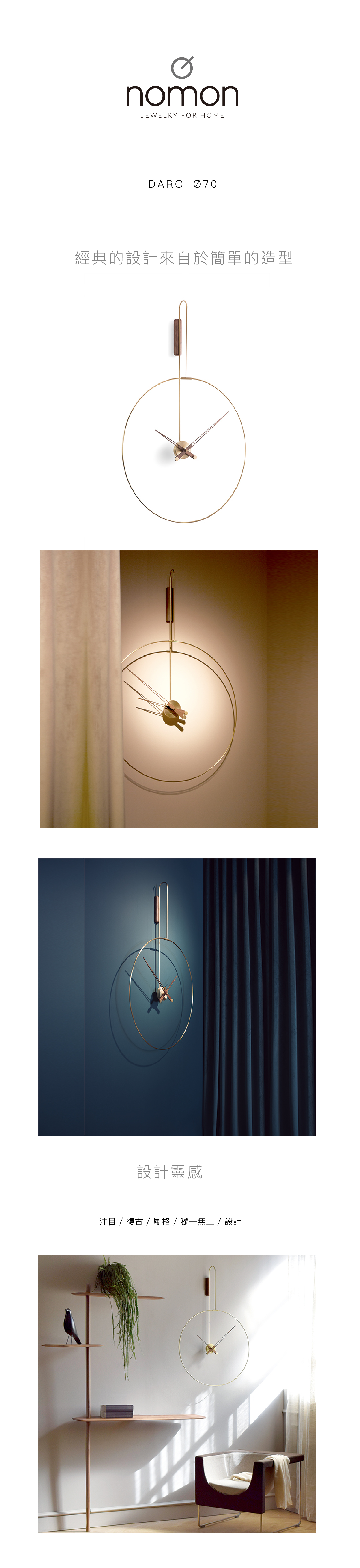 Nomon西班牙室內鐘錶品牌,由工業設計師José María Reina和珠寶設計師Angels Arrufat所創立,融合不同領域的設計專業,呈現時鐘獨特高貴性與區別性,產地於巴塞隆納以純手工製作,結合了工匠流程和創新技術,選用頂級材料並以珠寶製造嚴格標準製成,且具有獨特性質視覺上兼具另人驚嘆的高辨識度與美感。