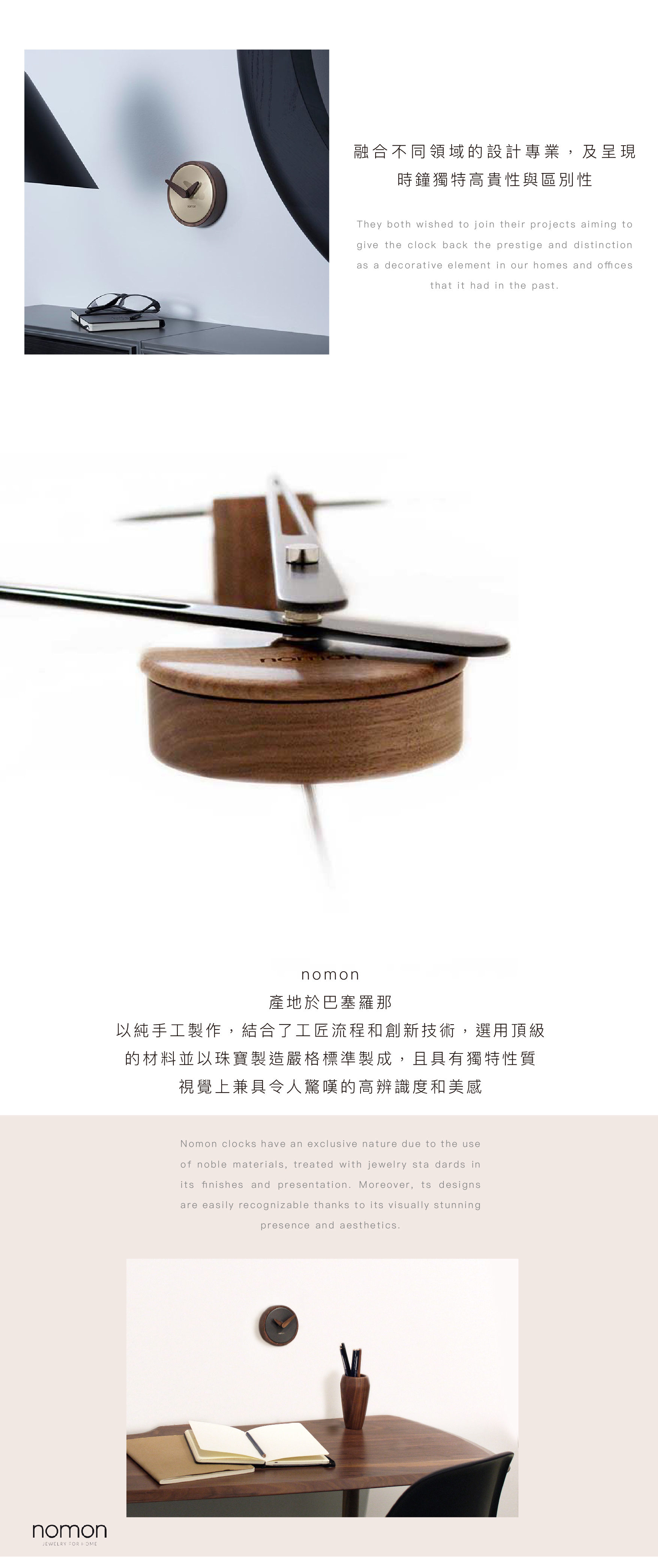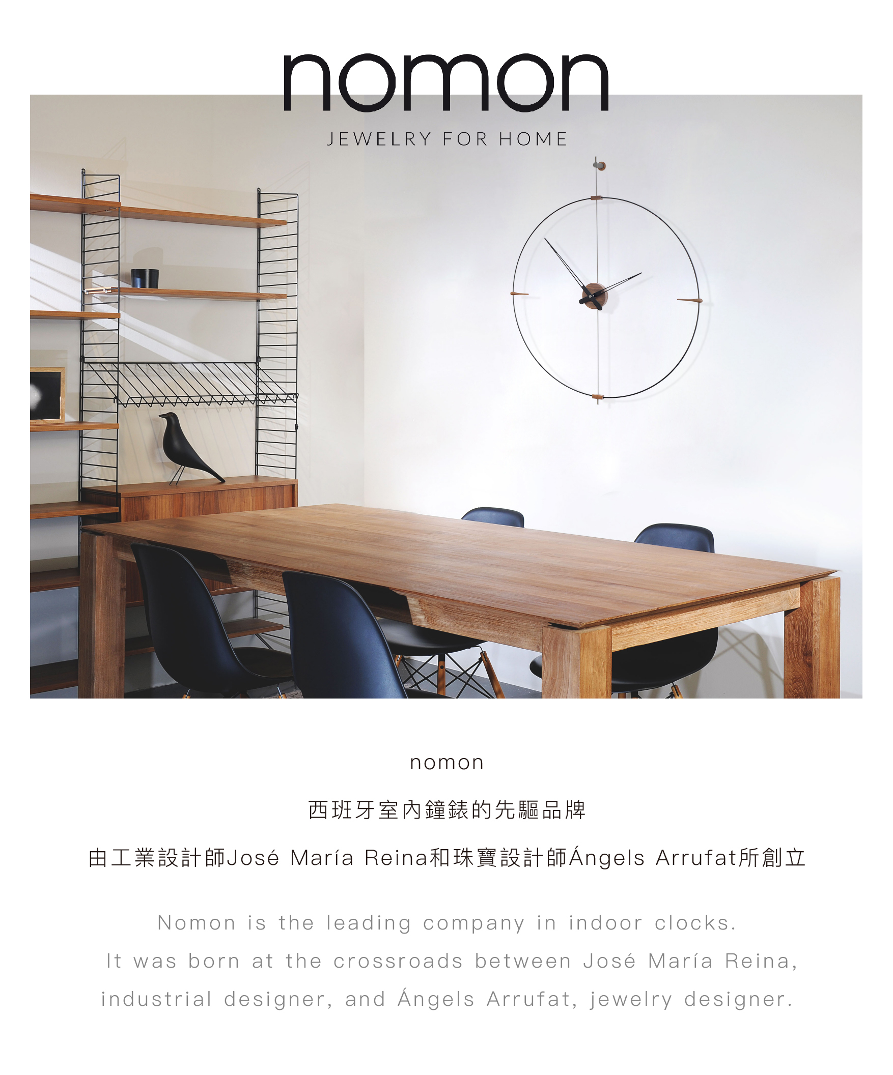 Nomon西班牙室內鐘錶品牌,由工業設計師José María Reina和珠寶設計師Angels Arrufat所創立,融合不同領域的設計專業,呈現時鐘獨特高貴性與區別性,產地於巴塞隆納以純手工製作,結合了工匠流程和創新技術,選用頂級材料並以珠寶製造嚴格標準製成,且具有獨特性質視覺上兼具另人驚嘆的高辨識度與美感。