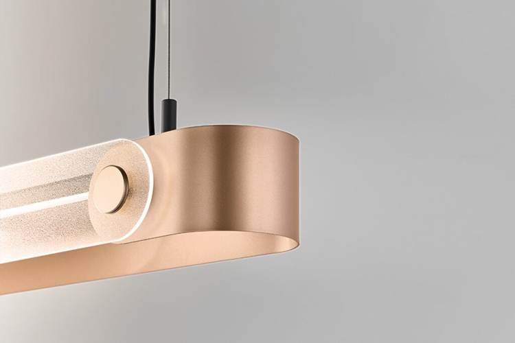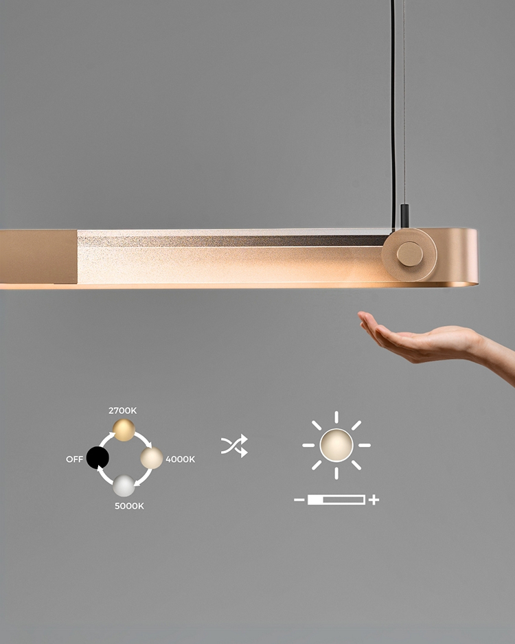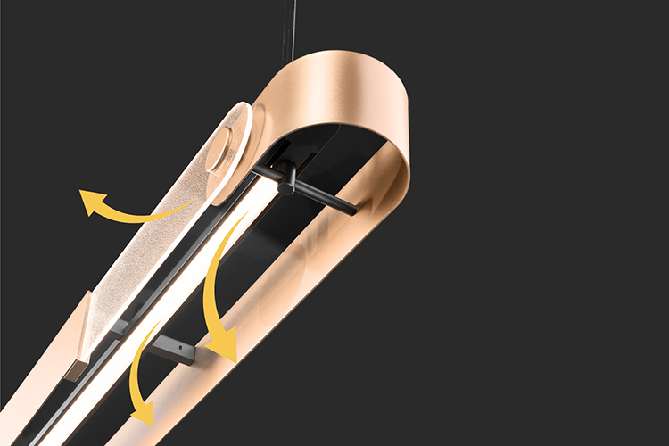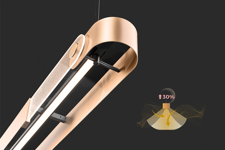金屬與光學導光曲鏡的結合,簡約奢華的茶金色外觀搭配低調科技灰的發光體是理性優雅,隨亮度變化的光板呈現若隱若現的穿透光感,三者相互交織出絢爛的視覺饗宴。